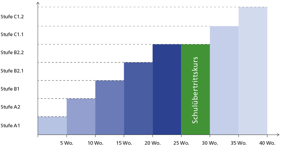 An die allgemeine Sprachausbildung schließt sich ein fünfwöchiger Schulübertrittskurs an, der sich besonders intensiv mit schulrelevanten Inhalten beschäftigt.